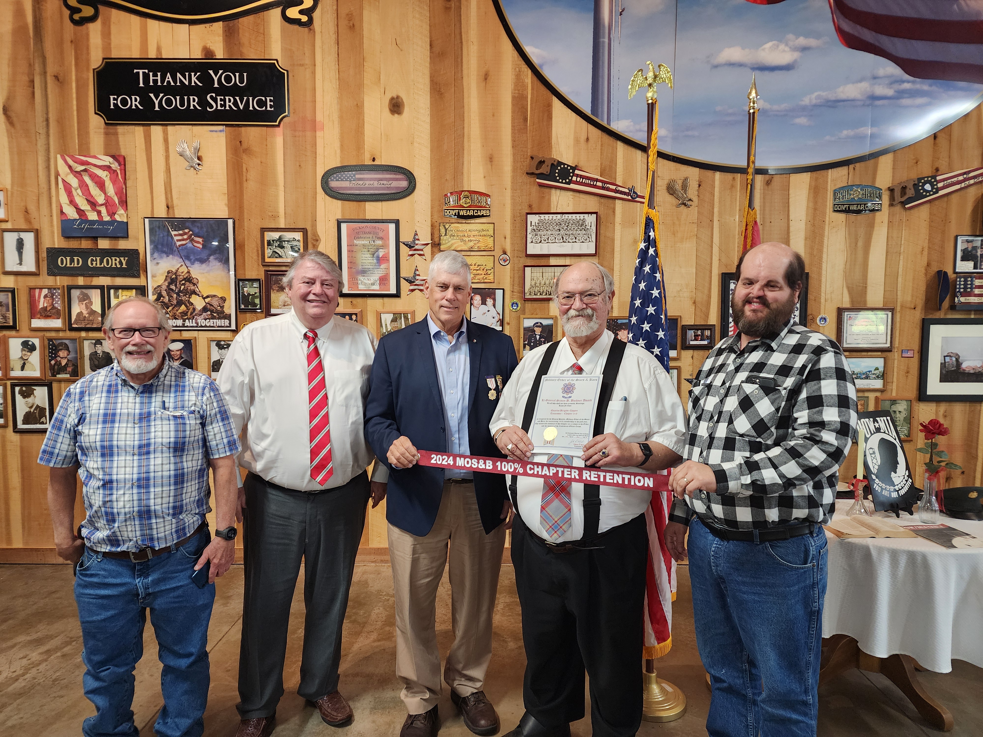 Quarles Brigade Chapter 319 Members receiving the MOS&B Buckner Award Certificate and Streamer for 100% retention.